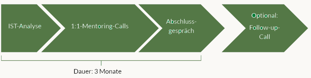Im Zentrum unserer Zusammenarbeit stehen regelmäßige Mentoring-Calls über einen Zeitraum von mindestens drei Monaten – auf Wunsch auch länger.